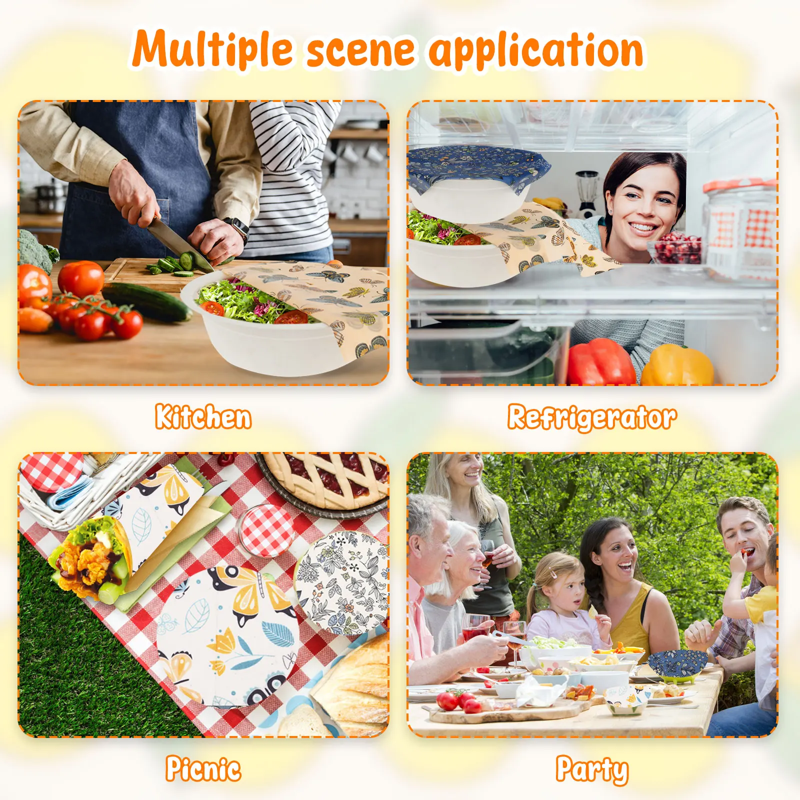 【Smart Sealing Technology】The beeswax layer of reusable beeswax wrap is flexible and sticky when it meets hand temperature , and it can realize airtight wrapping by pressing , and the unique double layer coating strengthens the endurance , effectively locking the water of fruits and vegetables , keeping cheese from drying out , and increasing the freshness length of the food by about 30%